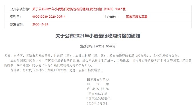 關(guān)于2021年小麥最低收購價有關(guān)政策的通知各省、自治區(qū)、直轄市發(fā)展改革委、糧食和物資儲備局(糧食局)、財政廳(局)、農(nóng)業(yè)農(nóng)村廳(局、委)、農(nóng)業(yè)發(fā)展銀行分行,中國儲備糧管理集團(tuán)有限公司、中糧集團(tuán)有限公司、中國供銷集團(tuán)有限公司、中國中化集團(tuán)有限公司:為保障國家糧食安全,進(jìn)一步完善糧食最低收購價政策,2021年繼續(xù)對最低收購價小麥限定收購總量?,F(xiàn)將具體事項通知如下。根據(jù)近幾年小麥最低收購價收購數(shù)量,限定2021年最低收購價小麥?zhǔn)召徔偭繛?700萬噸。(一)分批下達(dá)。限定收購總量分兩批次下達(dá),第一批數(shù)量為3330萬噸,不分配到??;第二批數(shù)量為370萬噸,視收購需要具體分配到省。當(dāng)最低收購價全國收購總量達(dá)到第一批數(shù)量的90%時,中儲糧有關(guān)分公司應(yīng)會同省級糧食等部門單位及時提出本省第二批收購的計劃數(shù)量建議。中儲糧集團(tuán)公司根據(jù)當(dāng)年小麥產(chǎn)量、收購量、農(nóng)戶余糧和市場價格等情況統(tǒng)籌平衡各省數(shù)量后,報國家糧食和物資儲備局批準(zhǔn)。國家糧食和物資儲備局通過政府網(wǎng)站公布各省第二批收購數(shù)量。在第一批收購?fù)瓿珊?,有關(guān)省份按照批準(zhǔn)的第二批數(shù)量繼續(xù)開展收購。當(dāng)收購量達(dá)到本省批準(zhǔn)數(shù)量時,立即停止該省最低收購價收購且不再啟動。(二)動態(tài)監(jiān)測。啟動最低收購價執(zhí)行預(yù)案后,中儲糧集團(tuán)公司要嚴(yán)格按照預(yù)案有關(guān)規(guī)定,加強(qiáng)統(tǒng)計監(jiān)測,每五日向國家糧食和物資儲備局報送收購進(jìn)度;啟動第二批收購后,中儲糧集團(tuán)公司要按日報送收購進(jìn)度。國家糧食和物資儲備局定期通過政府網(wǎng)站公布最低收購價全國收購總量。省級糧食等有關(guān)部門要結(jié)合小麥商品量和農(nóng)戶余糧情況,及時開展調(diào)研調(diào)度,全面掌握收糧進(jìn)度。(一)認(rèn)真落實限量收購政策。中儲糧集團(tuán)公司作為最低收購價政策執(zhí)行主體,要嚴(yán)格執(zhí)行限定收購總量的收購政策,不得超量收購。財政資金支持限于最低收購價政策下的最高收購總量內(nèi)。(二)加強(qiáng)市場監(jiān)管。各地要認(rèn)真落實糧食收儲制度改革精神,規(guī)范糧食流通市場秩序,依法依規(guī)嚴(yán)厲查處糧食收儲過程中的違法違規(guī)行為。(三)促進(jìn)“優(yōu)糧優(yōu)價”。各地要積極鼓勵農(nóng)企對接,充分發(fā)揮市場價格對生產(chǎn)的反饋引導(dǎo)作用,促進(jìn)種植結(jié)構(gòu)調(diào)整優(yōu)化,增加綠色優(yōu)質(zhì)安全產(chǎn)品供給。
