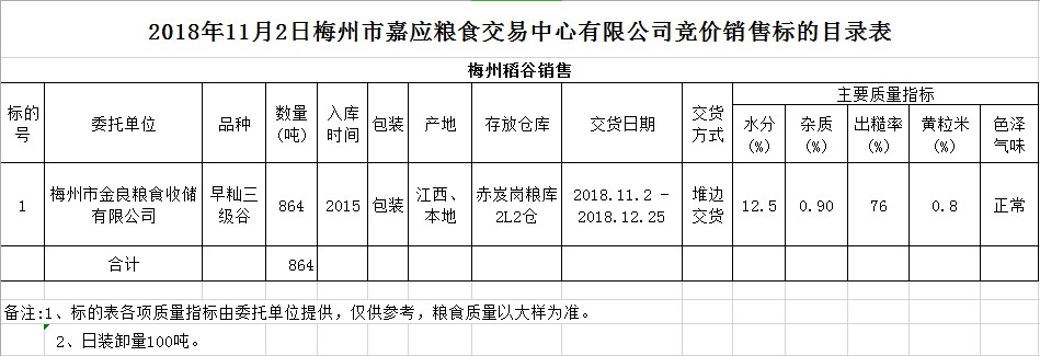 受客戶委托,梅州市嘉應(yīng)糧食交易中心有限公司定于2018年11月2日(星期五)舉辦糧食競(jìng)價(jià)交易會(huì),梅州市金良糧食收儲(chǔ)有限公司擬銷售2015年早秈稻864噸。
