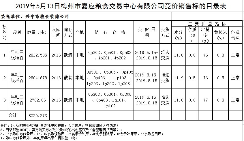 交易時間和地點:2019年5月13日(星期一)上午10時。廣東省梅州市彬芳大道南161號梅州市糧食交易中心3樓。