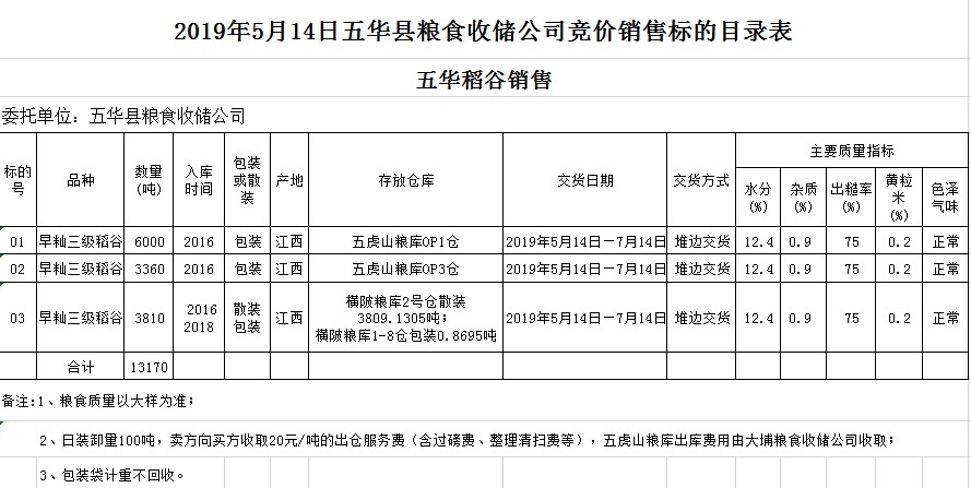受客戶委托,梅州市嘉應糧食交易中心有限公司定于2019年5月14日(星期二)舉辦糧食競價交易會,五華縣糧食收儲公司擬銷售2016年早秈稻13169.1305噸,2018年早秈稻0.8695噸。