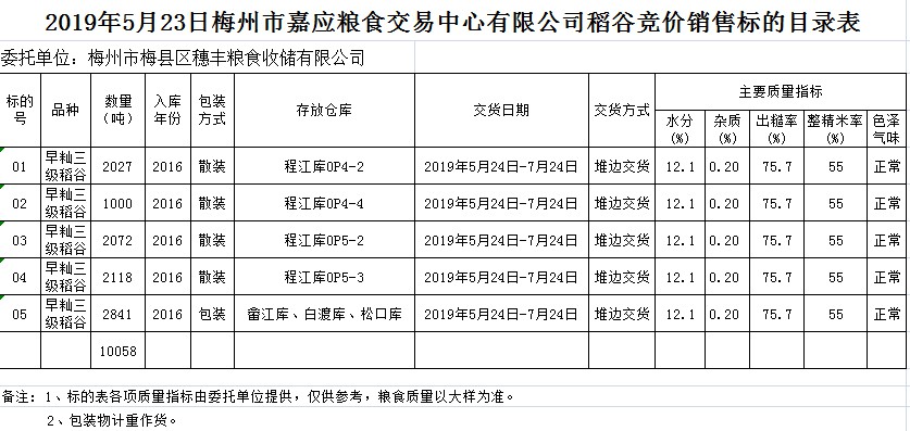 受客戶委托,梅州市嘉應(yīng)糧食交易中心有限公司定于2019年5月23日(星期四)舉辦糧食競(jìng)價(jià)交易會(huì),梅州市梅縣區(qū)穗豐糧食收儲(chǔ)有限公司擬銷售2016年早秈稻10058噸。