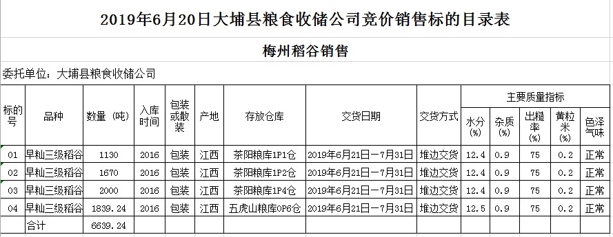 受客戶委托,梅州市嘉應(yīng)糧食交易中心有限公司定于2019年6月20日(星期四)舉辦糧食競價(jià)交易會,大埔縣糧食收儲公司擬銷售2016年早秈稻6639.24噸。