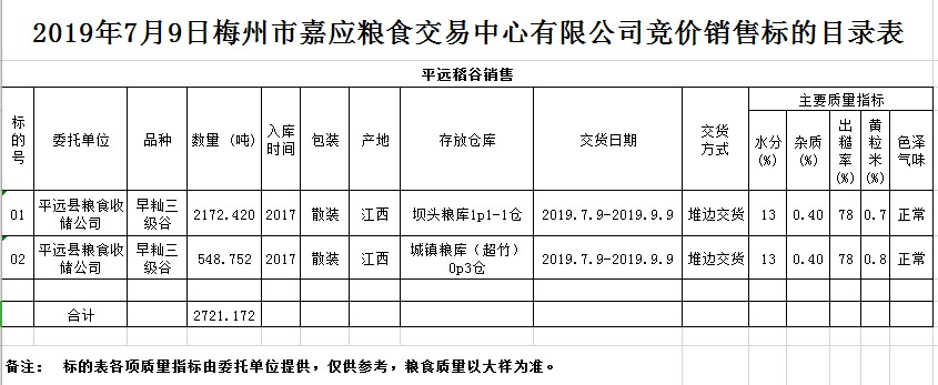 受客戶委托,梅州市嘉應(yīng)糧食交易中心有限公司定于2019年7月9日(星期二)舉辦糧食競(jìng)價(jià)交易會(huì),平遠(yuǎn)縣糧食收儲(chǔ)公司擬銷售2017年早秈稻2721.172噸。