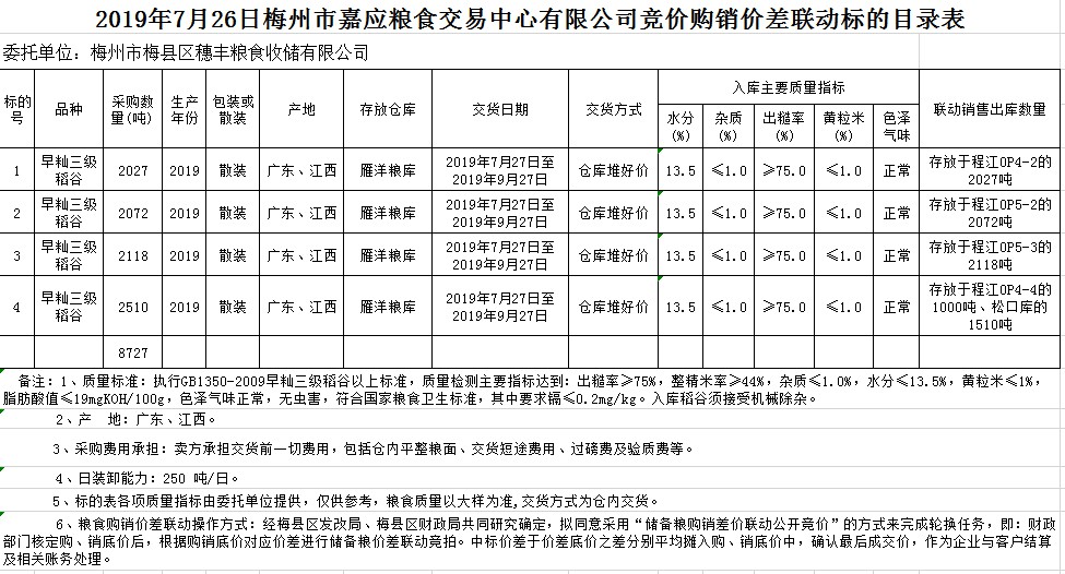 受客戶委托,梅州市嘉應(yīng)糧食交易中心有限公司定于2019年7月26日(星期五)舉辦稻谷購(gòu)銷價(jià)差聯(lián)動(dòng)標(biāo)的交易會(huì),梅州市梅縣區(qū)穗豐糧食收儲(chǔ)有限公司擬銷售和采購(gòu)早秈稻8727噸。