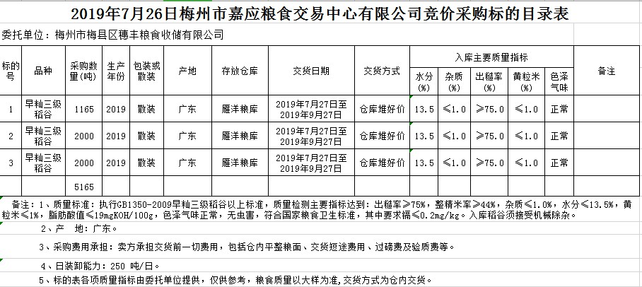 交易時間和地點:2019年7月26日(星期五)上午10時。廣東省梅州市彬芳大道南161號梅州市糧食交易中心3樓。
