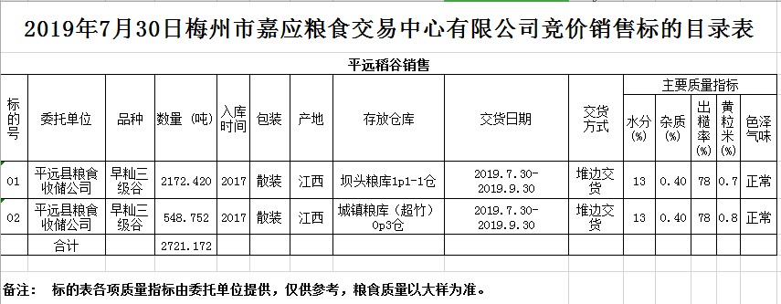 受客戶(hù)委托,梅州市嘉應(yīng)糧食交易中心有限公司定于2019年7月30日(星期二)舉辦糧食競(jìng)價(jià)交易會(huì),平遠(yuǎn)縣糧食收儲(chǔ)公司擬銷(xiāo)售2017年早秈稻2721.172噸。