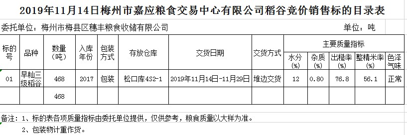 交易時間和地點:2019年11月14日(星期四)上午10時。廣東省梅州市彬芳大道南161號梅州市糧食交易中心3樓。