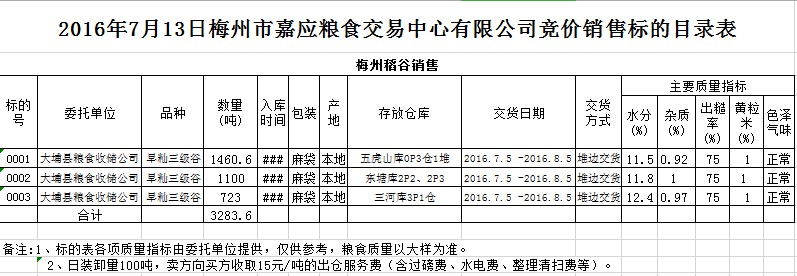 受客戶委托,梅州市嘉應糧食交易中心有限公司定于2016年7月13日舉辦糧食競價交易會,大埔縣糧食收儲公司擬銷售2013年早秈稻谷3283.6噸。