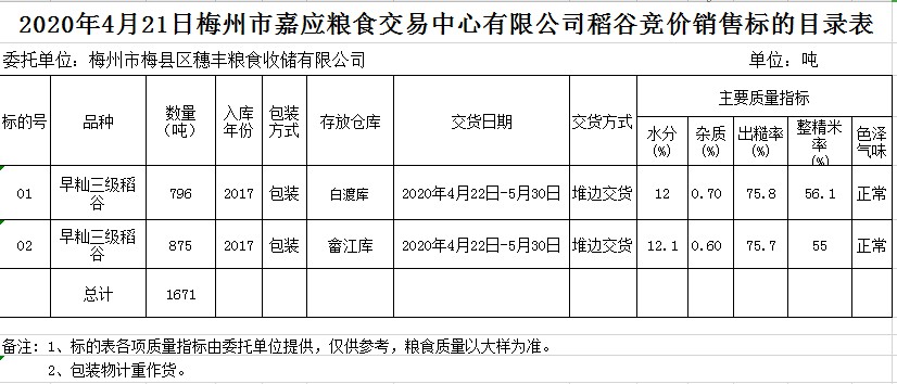 受客戶委托,梅州市嘉應(yīng)糧食交易中心有限公司定于2020年4月21日(星期二)舉辦糧食競(jìng)價(jià)交易會(huì),梅州市梅縣區(qū)穗豐糧食收儲(chǔ)有限公司擬銷售2017年早秈稻1671噸。