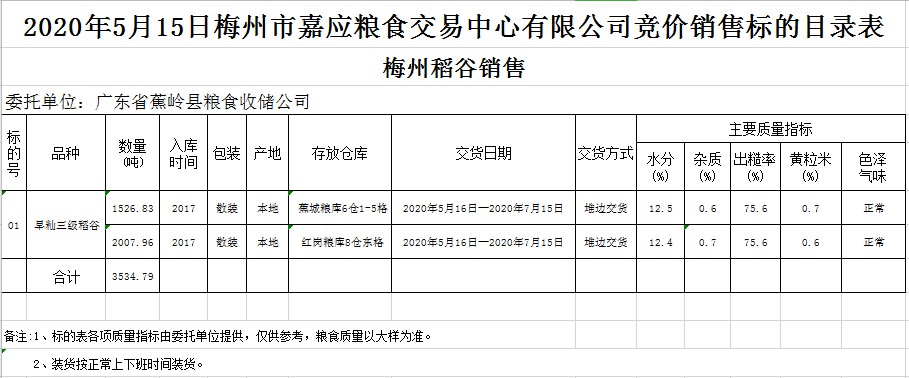 受客戶(hù)委托,梅州市嘉應(yīng)糧食交易中心有限公司定于2020年5月15日(星期五)舉辦糧食競(jìng)價(jià)交易會(huì),廣東省蕉嶺縣糧食收儲(chǔ)公司擬銷(xiāo)售2017年早秈稻3534.79噸。