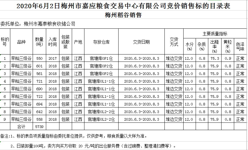 受客戶委托,梅州市嘉應(yīng)糧食交易中心有限公司定于2020年6月2日(星期二)舉辦糧食競(jìng)價(jià)交易會(huì),梅州市嘉泰糧食收儲(chǔ)公司擬銷售2017年、2018年早秈稻5739噸。