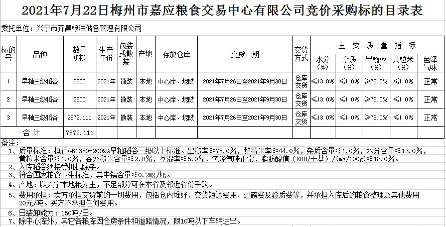 受客戶委托,梅州市嘉應(yīng)糧食交易中心有限公司定于2021年7月22日(星期四)舉辦糧食競價交易會。興寧市齊昌糧油儲備管理有限公司擬采購2021年早秈稻7572.111噸。
