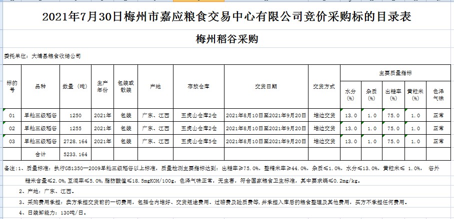 受客戶委托,梅州市嘉應糧食交易中心有限公司定于2021年7月30日(星期五)舉辦糧食競價交易會。大埔縣糧食收儲公司擬采購2021年早秈稻5233.164噸。