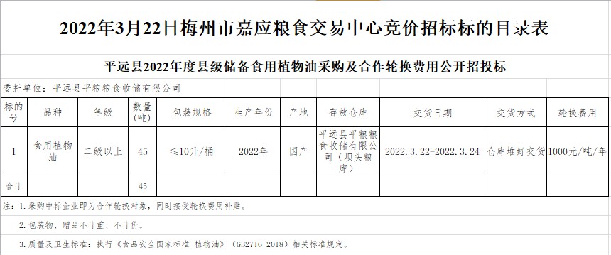 受客戶委托,梅州市嘉應(yīng)糧食交易中心有限公司定于2022年3月22日(星期二)上午10時(shí)在廣東省梅州市彬芳大道南161號(hào)梅州市糧食交易中心3樓,舉辦平遠(yuǎn)縣縣級(jí)食用植物油儲(chǔ)備采購及合作輪換費(fèi)公開招標(biāo)。