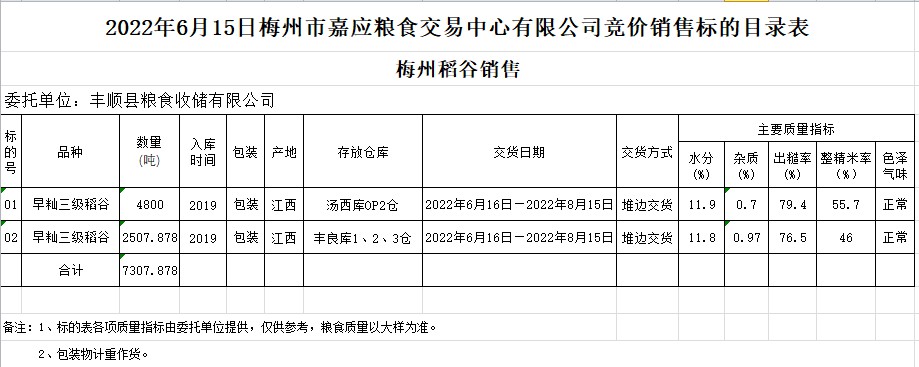 受客戶委托,梅州市嘉應(yīng)糧食交易中心有限公司定于2022年6月15日(星期三)舉辦糧食競價(jià)交易會(huì)。豐順縣糧食收儲(chǔ)有限公司擬銷售2019年早秈稻7307.878噸。