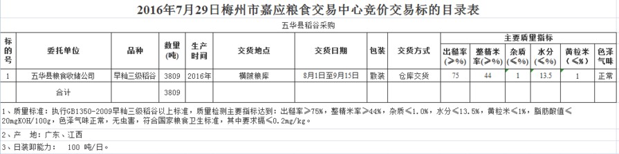 受客戶(hù)委托,梅州市嘉應(yīng)糧食交易中心有限公司定于2016年7月29日舉辦糧食競(jìng)價(jià)交易會(huì),廣東省五華縣糧食收儲(chǔ)公司擬采購(gòu)2016年產(chǎn)早秈三級(jí)稻谷3809噸。