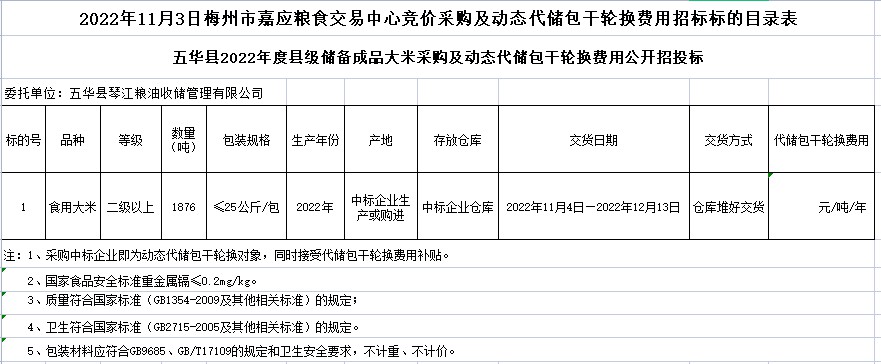 受客戶委托,梅州市嘉應(yīng)糧食交易中心有限公司定于2022年11月3日(星期四)上午10時在廣東省梅州市彬芳大道南161號梅州市糧食交易中心3樓,舉辦五華縣縣級成品糧采購及動態(tài)代儲包干輪換費(fèi)用公開招標(biāo)。
