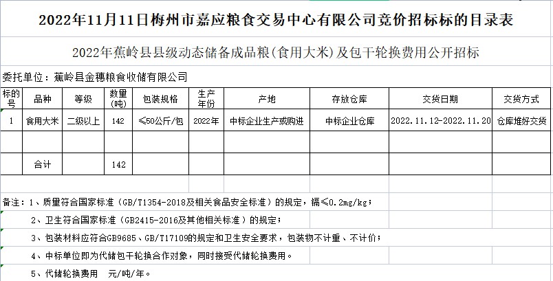 2022年蕉嶺縣縣級(jí)動(dòng)態(tài)儲(chǔ)備成品糧(食用大米)及包干輪換費(fèi)用公開(kāi)招標(biāo)公告
