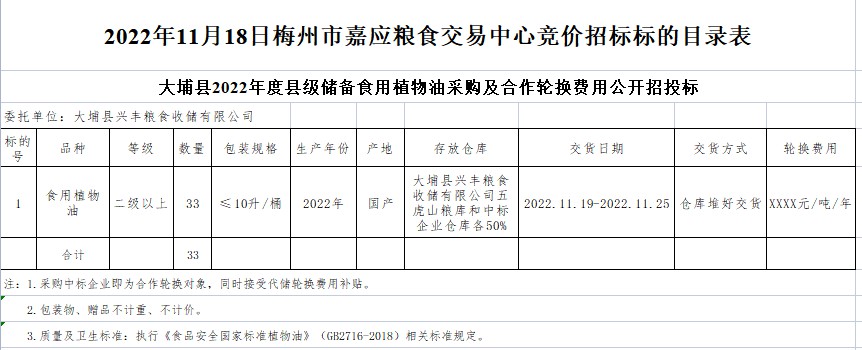 大埔縣2022年度縣級儲備食用植物油采購及合作輪換費用公開招投標公告