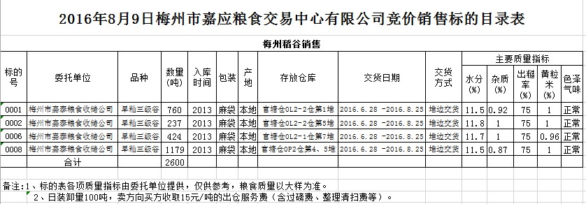 受客戶委托,梅州市嘉應(yīng)糧食交易中心有限公司定于2016年8月9日舉辦糧食競(jìng)價(jià)交易會(huì),梅州市嘉泰糧食收儲(chǔ)公司擬銷售2013年產(chǎn)早秈三級(jí)稻谷2600噸。