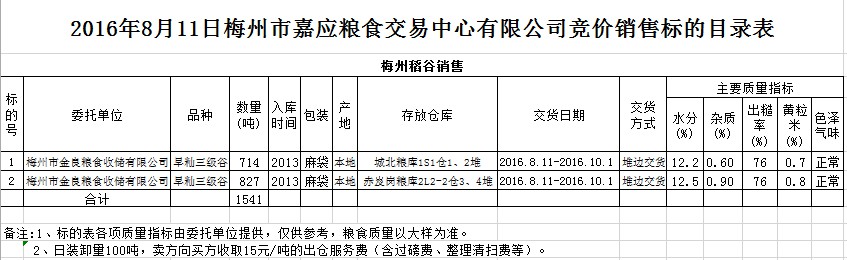 受客戶委托,梅州市嘉應(yīng)糧食交易中心有限公司定于2016年8月11日舉辦糧食競價交易會,梅州市金良糧食收儲有限公司擬銷售2013年產(chǎn)早秈三級稻谷1541噸。