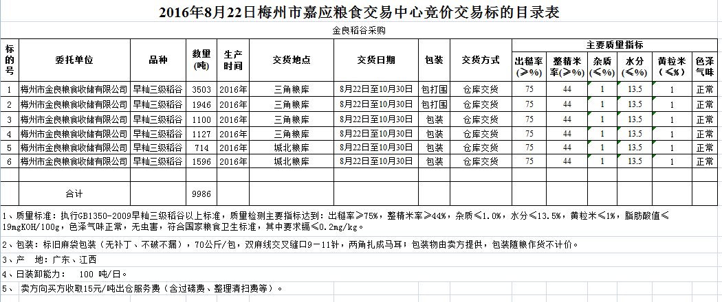 受客戶委托,梅州市嘉應(yīng)糧食交易中心有限公司定于2016年8月22日舉辦糧食競價交易會,梅州市金良糧食收儲有限公司擬采購2016年產(chǎn)早秈三級稻谷9986噸。