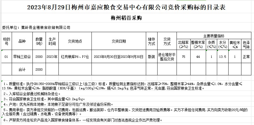 受客戶委托,梅州市嘉應(yīng)糧食交易中心有限公司定于2023年8月29日(星期二)舉辦糧食競(jìng)價(jià)交易會(huì)。蕉嶺縣金穗糧食收儲(chǔ)有限公司擬采購(gòu)2023年產(chǎn)早秈稻2000噸。