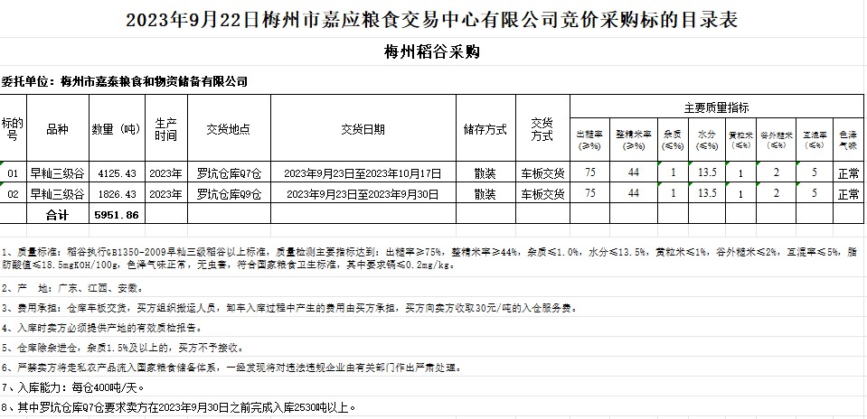 受客戶委托,梅州市嘉應(yīng)糧食交易中心有限公司定于2023年9月22日(星期五)舉辦糧食競價交易會。梅州市嘉泰糧食和物資儲備有限公司擬采購2023年早秈稻5951.86噸。