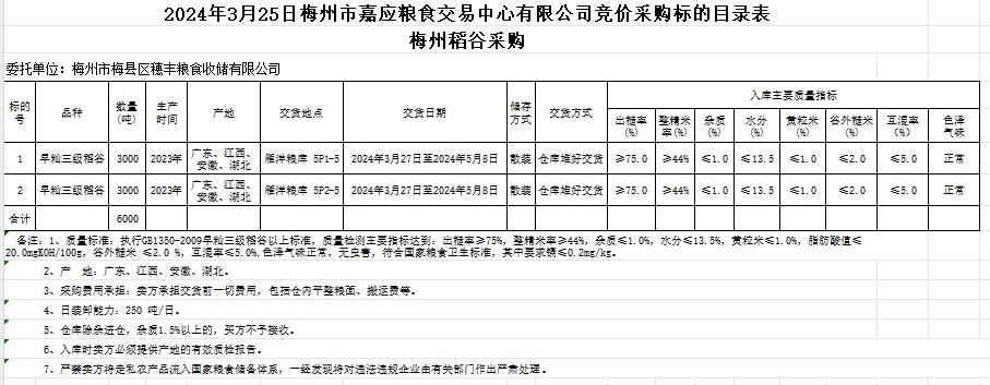 受客戶(hù)委托,梅州市嘉應(yīng)糧食交易中心有限公司定于2024年3月25日(星期一)舉辦糧食競(jìng)價(jià)交易會(huì)。梅州市梅縣區(qū)穗豐糧食收儲(chǔ)有限公司擬采購(gòu)2023年產(chǎn)早秈稻6000噸。