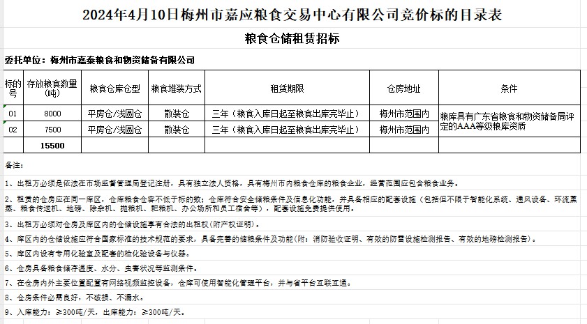 1.出租方必須是依法在市場監(jiān)督管理局登記注冊,具有獨立法人資格,具有梅州市內糧食倉庫的糧食企業(yè),經(jīng)營范圍應包含糧食業(yè)務;