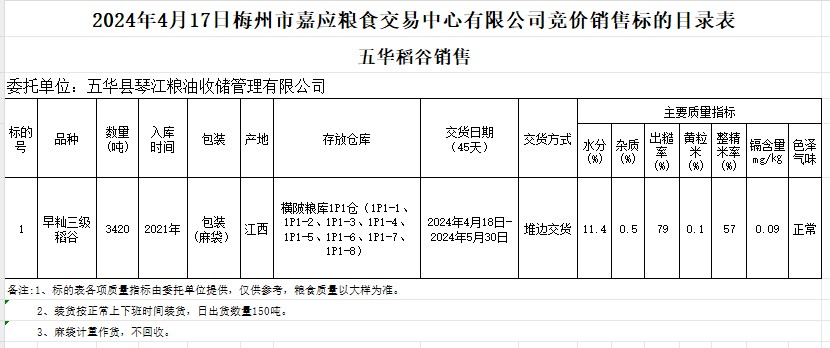 受客戶委托,梅州市嘉應糧食交易中心有限公司定于2024年4月17日(星期三)舉辦糧食競價交易會。五華縣琴江糧油收儲管理有限公司擬銷售2021年產早秈稻3420噸。
