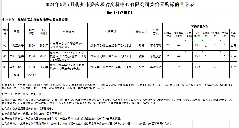 受客戶(hù)委托,梅州市嘉應(yīng)糧食交易中心有限公司定于2024年5月7日(星期二)舉辦糧食競(jìng)價(jià)交易會(huì)。梅州市嘉泰糧食和物資儲(chǔ)備有限公司擬采購(gòu)2023年產(chǎn)早秈稻15500噸。