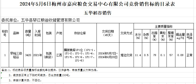 受客戶委托,梅州市嘉應(yīng)糧食交易中心有限公司定于2024年5月6日(星期一)舉辦糧食競(jìng)價(jià)交易會(huì)。五華縣琴江糧油收儲(chǔ)管理有限公司擬銷(xiāo)售2021年產(chǎn)早秈稻3420噸。