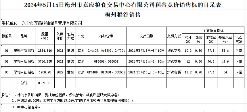 受客戶委托,梅州市嘉應(yīng)糧食交易中心有限公司定于2024年5月15日(星期三)舉辦糧食競價交易會。興寧市齊昌糧油儲備管理有限公司擬銷售2021年、2022年產(chǎn)早秈稻8539.581噸。
