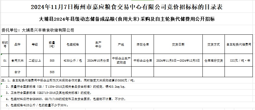 大埔縣2024年縣級(jí)動(dòng)態(tài)儲(chǔ)備成品糧(食用大米)采購及自主輪換代儲(chǔ)費(fèi)用公開招標(biāo)公告