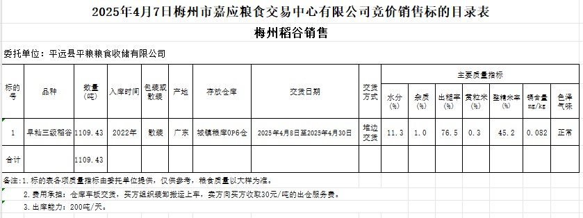 受客戶委托,梅州市嘉應(yīng)糧食交易中心有限公司定于2025年4月7日(星期一)舉辦糧食競價交易會。平遠(yuǎn)縣平糧糧食收儲有限公司擬銷售2022年產(chǎn)早秈稻1109.43噸。