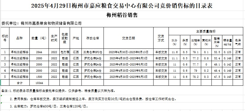 受客戶委托,梅州市嘉應(yīng)糧食交易中心有限公司定于2025年4月29日(星期二)舉辦糧食競價(jià)交易會(huì)。梅州市嘉泰糧食和物資儲備有限公司擬銷售2022年產(chǎn)早秈稻谷10344噸。