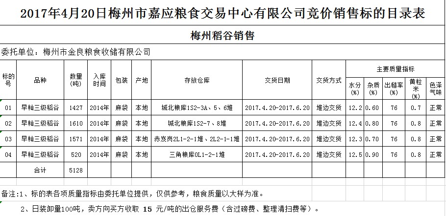 受客戶委托,梅州市嘉應(yīng)糧食交易中心有限公司定于2017年4月20日舉辦糧食競(jìng)價(jià)交易會(huì),梅州市金良糧食收儲(chǔ)有限公司擬銷售2014年早秈三級(jí)稻谷5128噸。