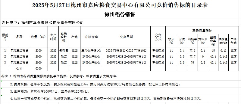 受客戶委托,梅州市嘉應(yīng)糧食交易中心有限公司定于2025年5月27日(星期二)舉辦糧食競價(jià)交易會(huì)。梅州市嘉泰糧食和物資儲(chǔ)備有限公司擬銷售2022年產(chǎn)早秈稻谷6300噸。