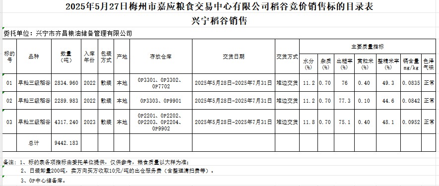 受客戶委托,梅州市嘉應(yīng)糧食交易中心有限公司定于2025年5月27日(星期二)舉辦糧食競價(jià)交易會。興寧市齊昌糧油儲備管理有限公司擬銷售2022年、2023年產(chǎn)早秈稻谷9442.183噸。