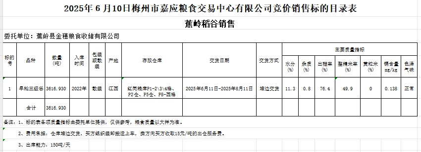 受客戶委托,梅州市嘉應(yīng)糧食交易中心有限公司定于2025年6月10日(星期二)舉辦糧食競(jìng)價(jià)交易會(huì)。蕉嶺縣金穗糧食收儲(chǔ)有限公司擬銷售2022年產(chǎn)早秈稻谷3616.930噸。