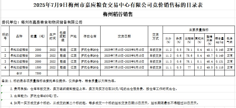 受客戶委托,梅州市嘉應糧食交易中心有限公司定于2025年7月9日(星期三)舉辦糧食競價交易會。梅州市嘉泰糧食和物資儲備有限公司擬銷售2022年產早秈稻谷7500噸。