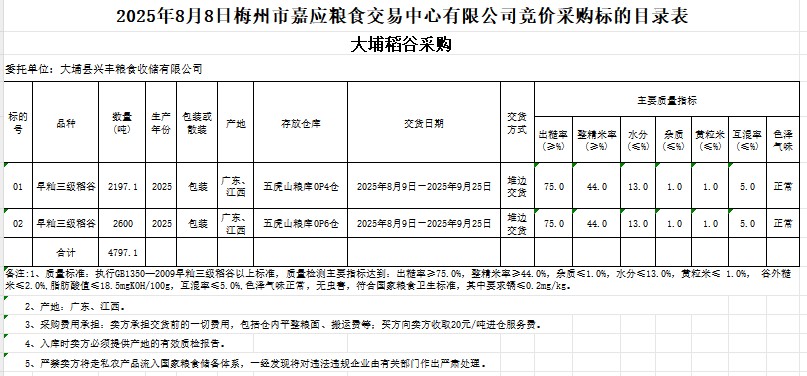 受客戶委托,梅州市嘉應(yīng)糧食交易中心有限公司定于2025年8月8日(星期五)舉辦糧食競(jìng)價(jià)交易會(huì)。大埔縣興豐糧食收儲(chǔ)有限公司擬采購(gòu)2025年產(chǎn)早秈稻谷4797.1噸。
