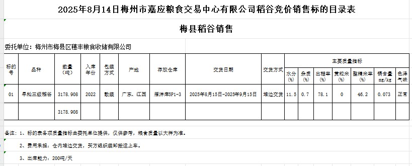 2025年8月14日梅州市梅縣區(qū)穗豐糧食收儲有限公司稻谷銷售