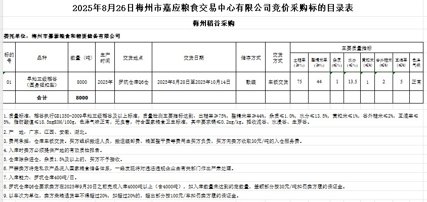 受客戶委托,梅州市嘉應(yīng)糧食交易中心有限公司定于2025年8月26日(星期二)舉辦糧食競(jìng)價(jià)交易會(huì)。梅州市嘉泰糧食和物資儲(chǔ)備有限公司擬采購(gòu)2025年產(chǎn)早秈稻谷8000噸。