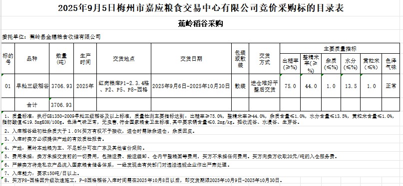 受客戶委托,梅州市嘉應(yīng)糧食交易中心有限公司定于2025年9月5日(星期五)舉辦糧食競價交易會。蕉嶺縣金穗糧食收儲有限公司采購2025年產(chǎn)早秈稻谷3706.93噸。