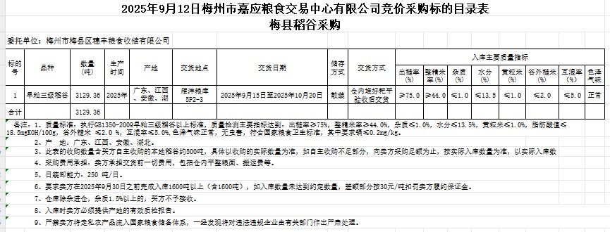 受客戶委托,梅州市嘉應(yīng)糧食交易中心有限公司定于2025年9月12日(星期五)舉辦糧食競價交易會。梅州市梅縣區(qū)穗豐糧食收儲有限公司擬采購2025年產(chǎn)早秈稻谷3129.36噸。