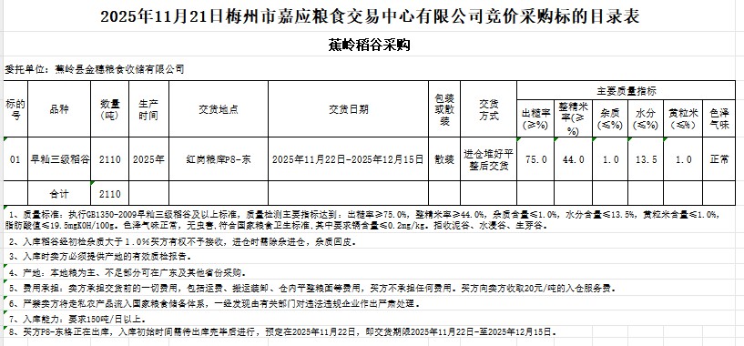 受客戶委托,梅州市嘉應(yīng)糧食交易中心有限公司定于2025年11月21日(星期五)舉辦糧食競(jìng)價(jià)交易會(huì)。蕉嶺縣金穗糧食收儲(chǔ)有限公司采購(gòu)2025年產(chǎn)早秈稻谷2110噸。