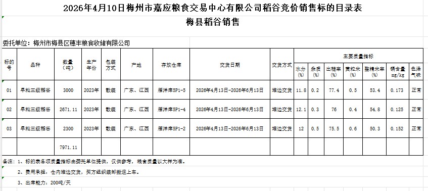 受客戶委托,梅州市嘉應(yīng)糧食交易中心有限公司定于2026年4月10日(星期五)舉辦糧食競價(jià)交易會(huì)。梅州市梅縣區(qū)穗豐糧食收儲(chǔ)有限公司擬銷售2023年產(chǎn)早秈稻谷7971.11噸。