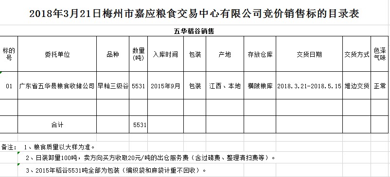 交易時間和地點(diǎn):2018年3月21日(星期三)上午10時。廣東省梅州市彬芳大道南161號梅州市糧食交易中心3樓。